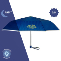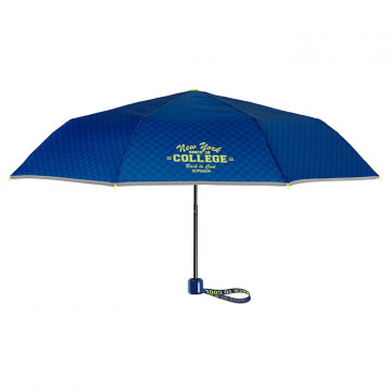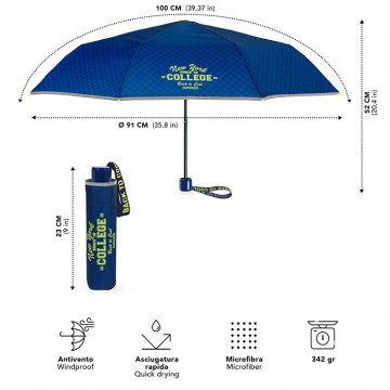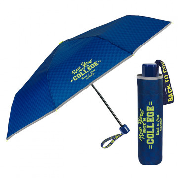 Този детски сгъваем чадър в тъмносин цвят е не само удобен, но и сигурен. Леката конструкция го прави идеален за ежедневно ползване, а светлоотразителният кант гарантира по-добра защита в тъмната част на деня. Перфектният избор за момче, което има нужда от надежден чадър за училище и разходки.