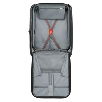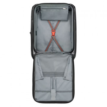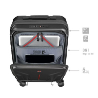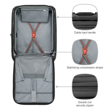 Този модел впечатлява с иновативен преден отвор, който позволява бързо и удобно отваряне отпред, без да се налага да поставяте куфара легнал.
